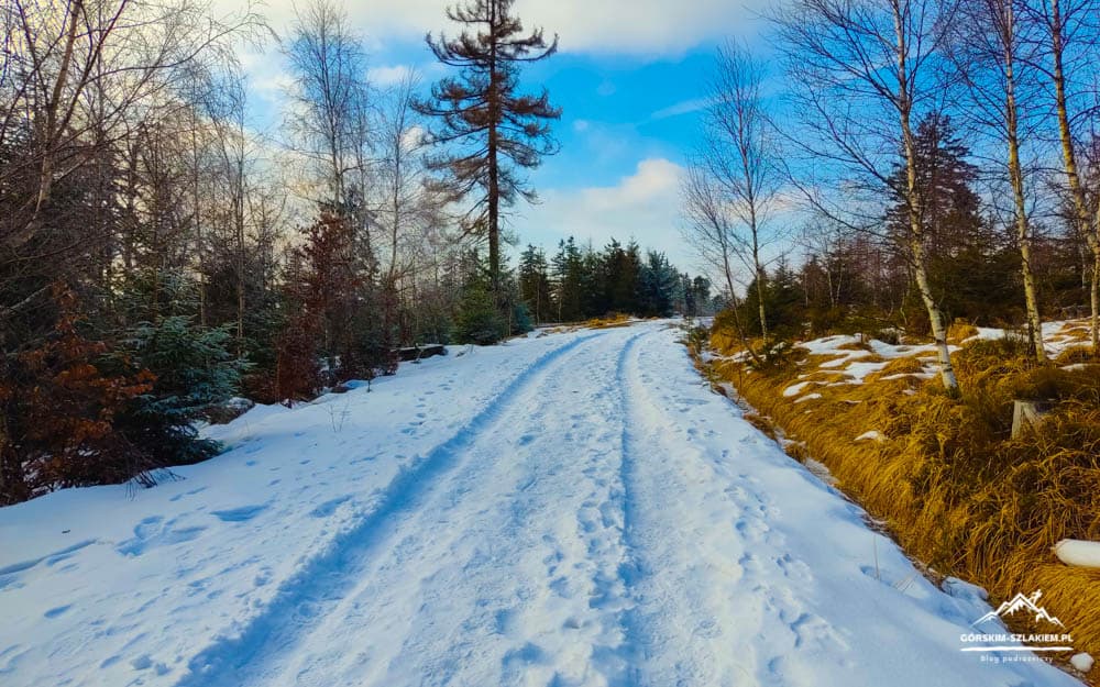 Naszą wycieczkę na Lustrzaną i Ptasią Górę w Górach Stołowych rozpoczynamy na Lisiej Przełęczy pod Karłowem. Lisia Przełęcz to jeden z popularniejszych punktów startowych w wiele ciekawych miejsc w Górach Stołowych. Aby dotrzeć z Lisiej Przełęczy na Lustrzaną i Ptasią Górę my udamy się z niej na północ, w nieco mniej uczęszczane rejony Gór Stołowych. Po opuszczeniu Lisiej Przełęczy, na dobry początek całej wyprawy zmierzycie się tu z dość stromym podejściem na wzniesienie Ptak (835 m. n.p.m.) w masywie Skalniaka, na którym zwiedzicie ruiny dawnego Fortu Karola. Fort Karola w Górach Stołowych to dawny pruski fort obronny z XVIII wieku, który niegdyś stanowił część systemu fortyfikacji obronnych Prus. Dziś miejsce to jest chętnie odwiedzanym punktem widokowym, z którego doskonale widać cały masyw najwyższego szczytu Gór Stołowych – Szczelińca Wielkiego. Podejście na Fort Karola z Lisiej Przełęczy odbywa się łączonym szlakiem zielono-żółto-niebieskim i średnio zajmuje około 10 minut czasu. Po zwiedzaniu Fortu Karola kontynuujcie następnie marsz zielonym szlakiem turystycznym, który zacznie prowadzić was przez las wzdłuż sudeckiej Szosy Stu Zakrętów. Odcinek zielonego szlaku przy Szosie Stu Zakrętów ma około 2,3 kilometra i prowadzi on przez gęsty las zboczem Skalniaka (915 m. n.p.m.). Podczas marszu zielonym szlakiem uważnie spoglądajcie na prawą stronę szlaku. Tam bowiem po około 30 minutach marszu wśród zarośli znajdziecie ukryte wejście na Ścieżkę Edukacyjną im. inż. Kazimierza Klimowicza, która zaprowadzi was prosto na pierwszy szczyt na trasie wycieczki, czyli na Lustrzaną Górę.
