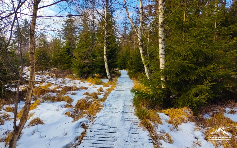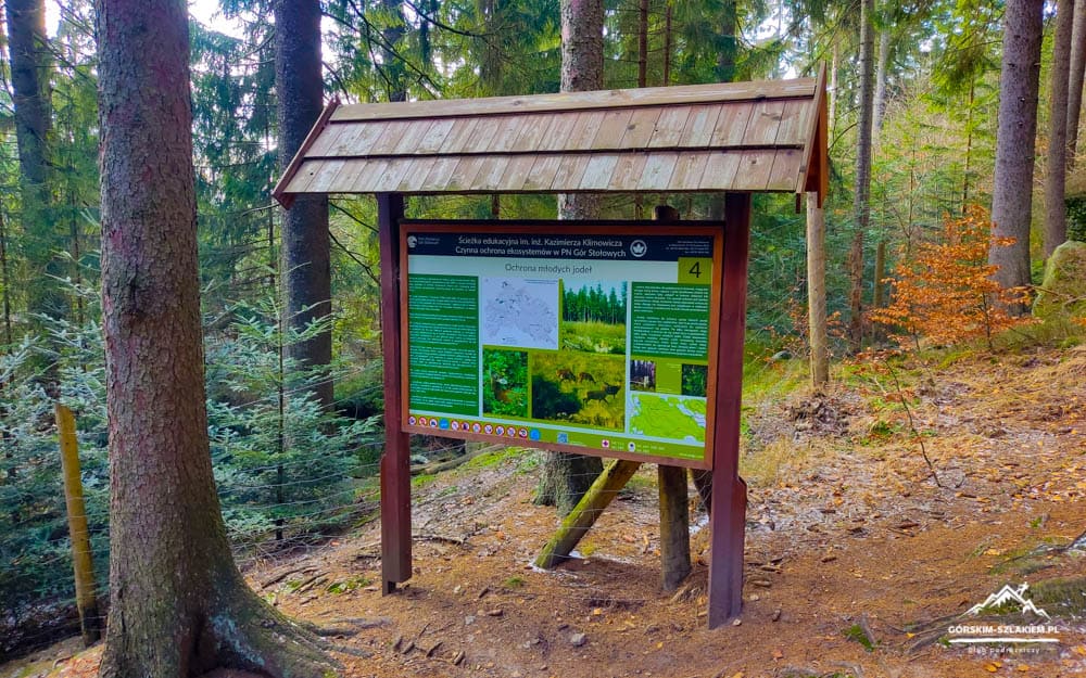 Po około 30 minutach marszu zielonym szlakiem z Lisiej Przełęczy trasa wycieczki wprowadzi was na Ścieżkę Edukacyjną im. Kazimierza Klimowicza. Ścieżka Edukacyjna im. inż. Kazimierza Klimowicza to około 4 kilometrowa leśna ścieżka wytyczona w masywie Skalniaka, która łączy parking na polanie YMCA z Błędnymi Skałami. Ścieżka ta oznakowana jest zielonym liściem i przeprowadzi was ona przez nieco bardziej dzikie rejony Gór Stołowych. Wchodząc na Ścieżkę Edukacyjną im. inż. Kazimierza Klimowicza będziecie mieli niepowtarzalną okazję poznać tu wiele fascynujących ciekawostek przyrodniczych na temat ekosystemu oraz gospodarki leśnej Gór Stołowych. Wszystkie najważniejsze informacje na temat ekosystemu Gór Stołowych przedstawione zostały w formie 12 tablic edukacyjnych, na których zawarto informacje na temat: Sposobów przebudowy drzewostanów Gór Stołowych, etapów sukcesji ekologicznej skał piaskowcowych, działań ochronnych tutejszych łąk i torfowisk oraz innych ciekawostek na temat Parku Narodowego Gór Stołowych. Warto tutaj wspomnieć, że na podejściu Ścieżki Edukacyjnej im. Kazimierza Klimowicza jest sporo stromych podejść, oraz dużo skał i korzeni drzew. Przygotujcie się tu zatem na nieco większy wysiłek, który zostanie oczywiście nagrodzony możliwością poznania tajemnic tutejszej przyrody, jak również podczas podejścia pooglądacie z tej ścieżki piękne krajobrazy Gór Stołowych.