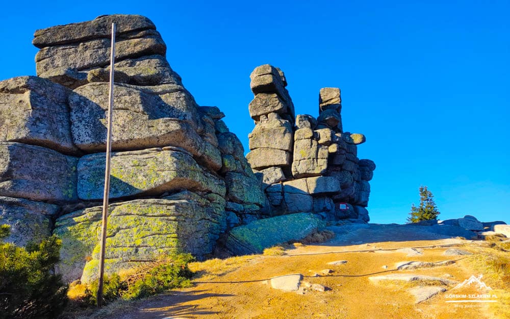 W drodze na Łabski Szczyt przy szlaku znajdziecie fajną ciekawostkę geologiczną, czyli Kukułcze Skały. Kukułcze Skały to grupa skałek zbudowana z unikatowego granitu karkonoskiego, która położona jest na północnym zboczu Śląskiego Grzbietu. Formację tą tworzy zgrupowanie trzech skałek w kształcie wysokich baszt o wysokości 7 metrów i kilka pomniejszych bloków skalnych. Środkowy filar skalny Kukułczych Skał nosi nazwę „Wahadła” i ponoć gdy w Karkonoszach wieją silne wiatry są one w stanie wprawić go w ruch. Przyglądając się Kukułczym Skałom z bliska będziecie mogli zobaczyć na ich powierzchni skutki naturalnych procesów geologicznych w postaci spękań biegnących w trzech różnych kierunkach – czyli tzw. ciosów granitowych. Przy Kukułczych Skałach na turystów czeka też punkt odpoczynkowy. Znajdziecie na nim kilka ławeczek, oraz tablicę informacyjną z dokładnym opisem Kukułczych Skał. Kukułcze Skały zwiedza się w ramach zakupionego biletu wstępu do Karkonoskiego Parku Narodowego.