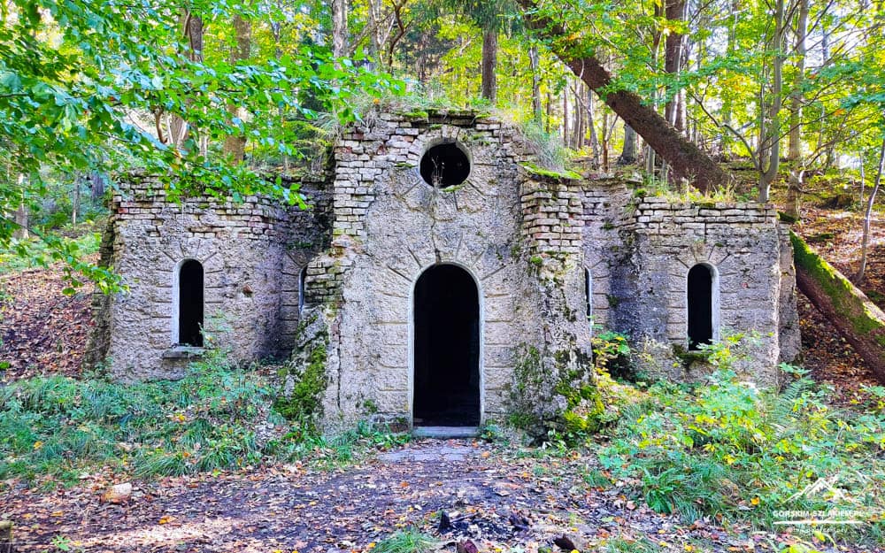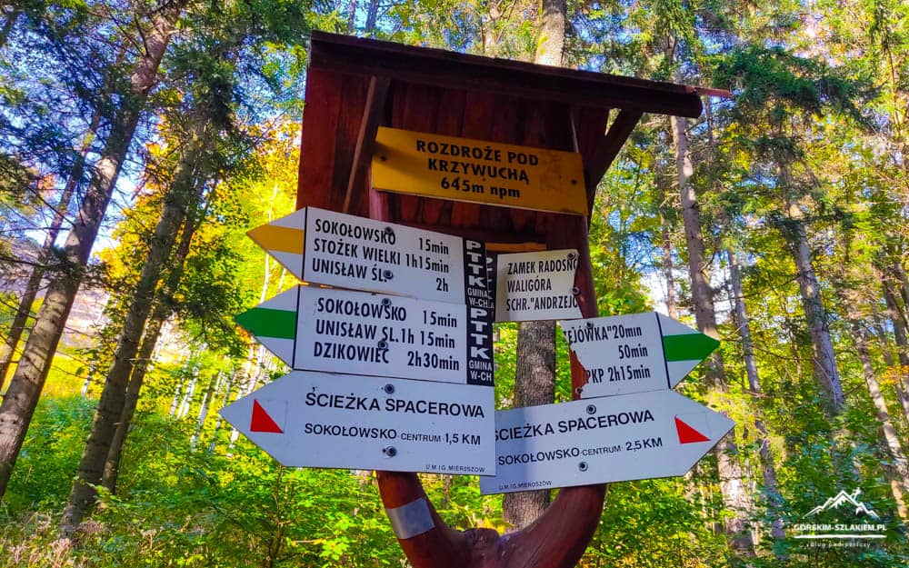 Po zwiedzaniu wszystkich atrakcji w Sokołowsku wracamy do centrum miasta i ruszamy w stronę Zamku Radosno. W tym wariancie trasy wycieczkowej na Zamek Radosno również zaprowadzi was żółty szlak turystyczny, który opuszcza Sokołowsko na wschód, w stronę schroniska Andrzejówka. W początkowym etapie marszu z Sokołowska na Zamek Radosno zmierzycie się tu z około kilometrowym odcinkiem asfaltowej drogi, która na szczęście szybko ustąpi miejsca leśnej, szutrowej drodze dojazdowej. Spacerując żółtym szlakiem z Sokołowska przy trasie wycieczki odnajdziecie też aż 12 tablic edukacyjno-przyrodniczych opowiadających wiele ciekawostek na temat Gór Kamiennych, Parku Krajobrazowego Sudetów Wałbrzyskich oraz tutejszego obszaru Natura 2000. Po pokonaniu pierwszego kilometra szutrowej drogi kontynuujcie marsz za oznaczeniami żółtego szlaku, aż dojdziecie do skrzyżowania szlaków Pod Krzywuchą. Tutaj przywita was budynek Chaty Marianka oraz zielony szlak turystyczny do Schroniska PTTK Andrzejówka. Was w tym miejscu nadal jednak interesują wyłącznie znaki żółtego szlaku, przy którym odnajdziecie już główną ścieżkę prowadzącą prosto do ruin zamku. Pokonanie ostatniego odcinka żółtego szlaku zajmuje około 15 minut czasu i zmierzycie się na nim z dość stromym podejściami i kilkoma przeszkodami terenowymi. Nie jest to jednak nic trudnego, z czym moglibyście sobie nie poradzić i po chwili wspinaczki będziecie już zwiedzać teren Zamku Radosno.
