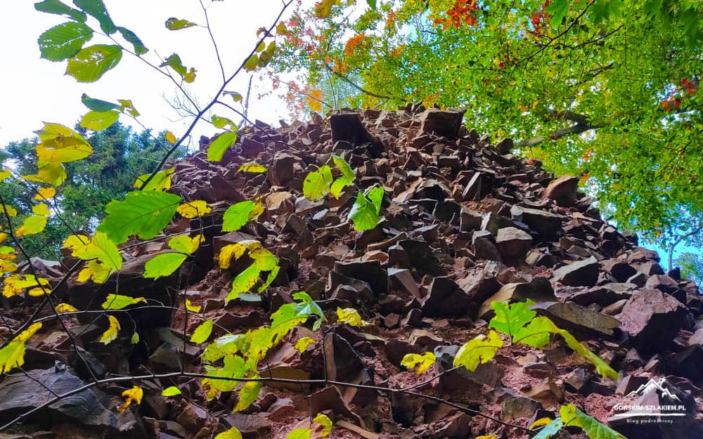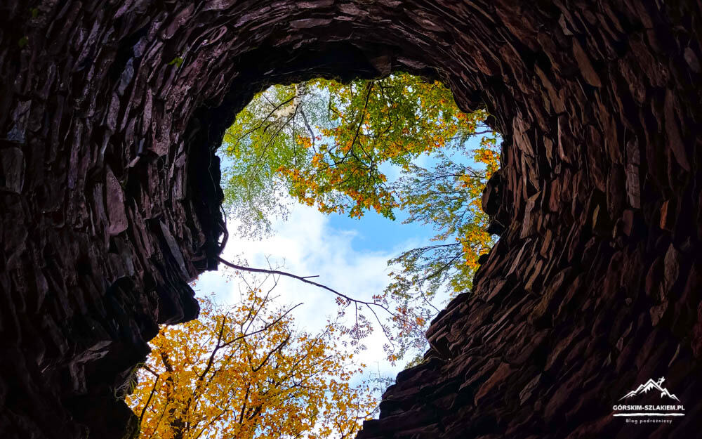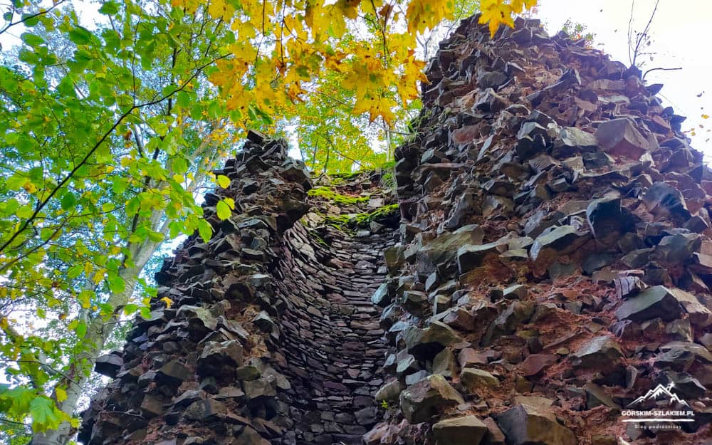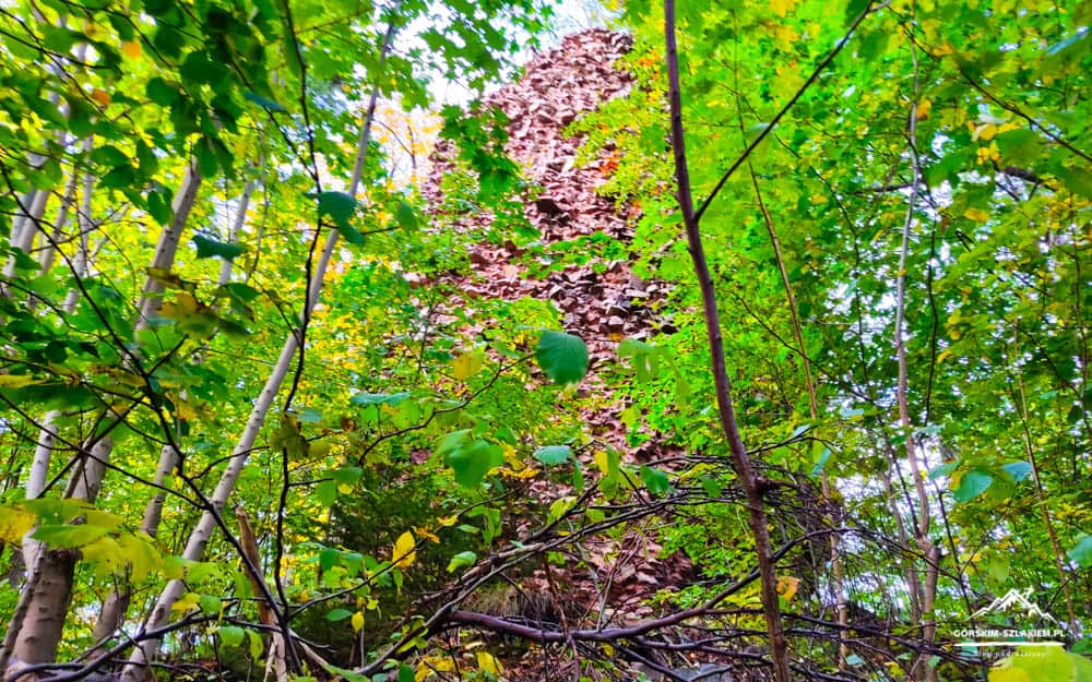 Czas teraz na kilka słów na temat samego zwiedzania terenu Zamku Radosno w Górach Kamiennych. Zamek Radosno to dziś niestety zapomniana ruina, która stoi na bezimiennym wzgórzu, na wysokości 770 m. n.p.m. Zamek Radosno według kronik był ponoć jedną z inwestycji księcia świdnickiego Bolka I i od 1355 roku był on częścią sokołowskiego lenna rycerskiego. Twierdza ta w czasach średniowiecznych składała się z dużej wieży obronnej, domu mieszkalnego, murów obronnych do których dostępu broniła wieża bramna, podzamcza, oraz głębokiej na cztery metry fosy. Większość elementów i budynków Zamku Radosno wzniesiona została z powszechnie występującego w tej części Gór Kamiennych melafiru – skały magmowej, która po dziś dzień wydobywana jest w okolicznym kamieniołomie w Rybnicy Leśnej. W średniowieczu twierdza ta była ważnym punktem obronno-wypoczynkowym i Górach Kamiennych. Do dzisiejszych czasów z Zamku Radosno pozostała już niestety tylko smutna ruina wieży obronnej o wysokości około 12 metrów, oraz resztki budynku mieszkalnego w północno-zachodniej części zamku. Ruiny Zamku Radosno można zwiedzać o każdej porze roku, tak w dzień jak i w nocy. Podczas zwiedzania należy jednak zachować tam szczególną ostrożność, gdyż obiekt ten nie jest w żaden sposób zabezpieczony, ani też konserwowany. Zamek Radosno ogląda się, spacerując wydeptaną ścieżką wokół wieży obronnej, na którą nie da się jednak niestety wejść. Jest jednak możliwość wejścia do samego jej wnętrza, ale trzeba tam uważać na odpadające ze ścian ostre kawałki skał. Jeżeli interesuje was dokładniejsza historia tej średniowiecznej warowni to więcej ciekawostek na jej temat dowiecie się z tablic edukacyjnych, które znajdziecie przy żółtym szlaku turystycznym z Sokołowska. Jeżeli lubicie zwiedzać nieoczywiste atrakcje, to wycieczka na Zamek Radosno z Rybnicy Leśnej i Sokołowska będzie dla was idealna. Polecamy!