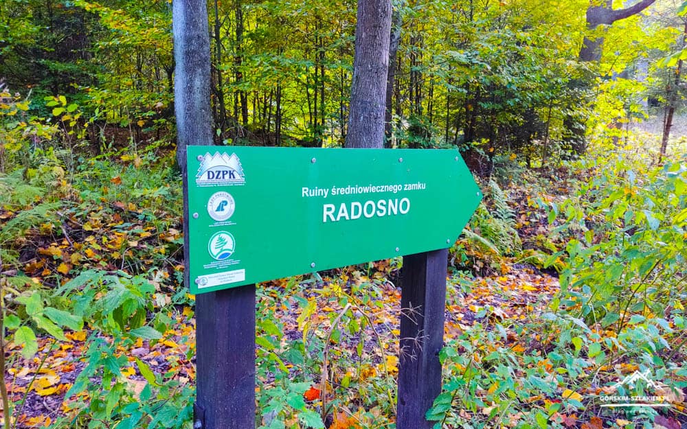 Wycieczka na Zamek Radosno w Górach Kamiennych to świetna opcja na krótką wycieczkę edukacyjną dla rodzin z dziećmi, miłośników historii, oraz początkujących turystów. Jedną z najchętniej wybieranych tras wycieczki na Zamek Radosno jest trasa rozpoczynająca się w niewielkiej miejscowości Rybnica Leśna pod Wałbrzychem. Wędrówka na Zamek Radosno z Rybnicy Leśnej rozpoczyna się przy budynku Schroniska PTTK Andrzejówka, które jest jednym z najbardziej popularnych i obleganych przez turystów punktów wypoczynkowych w Górach Kamiennych. Po minięciu Schroniska PTTK Andrzejówka wejdźcie na Przełęcz Trzech Dolin, na której odnajdźcie duży drewniany drogowskaz. Na drogowskazie tym znajdziecie szlakowskaz, który skieruje was w prawo na zielony szlak turystyczny prowadzący w stronę Sokołowska. Szlak ten poprowadzi was spod Andrzejówki na bardzo łatwą, żwirową drogą i dalej na teren Parku Krajobrazowego Gór Wałbrzyskich. Po około 5 minutach marszu zielonym szlakiem z Przełęczy Trzech Dolin dotrzecie pod tablicę edukacyjną z numerem „7”, obok którego znajduje się duże rozdroże. Na rozdrożu tym poszukajcie wśród zarośli dużego drogowskazu z napisem „Ruiny średniowiecznego zamku – RADOSNO”. Drogowskaz ten skieruje was na lekkie podejście i dalej na szlak żółty, którym dotrzecie już prosto do Zamku Radosno. Warto tu dodać, że odcinek żółtego szlaku do Zamku Radosno z Rybnicy Leśnej to wąska leśna ścieżka, porośnięta gęstymi zaroślami i usłana jest ona drobnymi odłamkami skalnymi. Przygotujcie się tu zatem na trochę przedzierania przez krzaki i nieco większe utrudnienia. Jest to jednak najkrótsza droga na Zamek Radosno i nie powinna ona sprawić wam żadnych większych problemów.