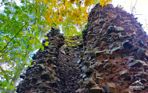 Czas teraz na kilka słów na temat samego zwiedzania terenu Zamku Radosno w Górach Kamiennych. Zamek Radosno to dziś niestety zapomniana ruina, która stoi na bezimiennym wzgórzu, na wysokości 770 m. n.p.m. Zamek Radosno według kronik był ponoć jedną z inwestycji księcia świdnickiego Bolka I i od 1355 roku był on częścią sokołowskiego lenna rycerskiego. Twierdza ta w czasach średniowiecznych składała się z dużej wieży obronnej, domu mieszkalnego, murów obronnych do których dostępu broniła wieża bramna, podzamcza, oraz głębokiej na cztery metry fosy. Większość elementów i budynków Zamku Radosno wzniesiona została z powszechnie występującego w tej części Gór Kamiennych melafiru – skały magmowej, która po dziś dzień wydobywana jest w okolicznym kamieniołomie w Rybnicy Leśnej. W średniowieczu twierdza ta była ważnym punktem obronno-wypoczynkowym i Górach Kamiennych. Do dzisiejszych czasów z Zamku Radosno pozostała już niestety tylko smutna ruina wieży obronnej o wysokości około 12 metrów, oraz resztki budynku mieszkalnego w północno-zachodniej części zamku. Ruiny Zamku Radosno można zwiedzać o każdej porze roku, tak w dzień jak i w nocy. Podczas zwiedzania należy jednak zachować tam szczególną ostrożność, gdyż obiekt ten nie jest w żaden sposób zabezpieczony, ani też konserwowany. Zamek Radosno ogląda się, spacerując wydeptaną ścieżką wokół wieży obronnej, na którą nie da się jednak niestety wejść. Jest jednak możliwość wejścia do samego jej wnętrza, ale trzeba tam uważać na odpadające ze ścian ostre kawałki skał. Jeżeli interesuje was dokładniejsza historia tej średniowiecznej warowni to więcej ciekawostek na jej temat dowiecie się z tablic edukacyjnych, które znajdziecie przy żółtym szlaku turystycznym z Sokołowska. Jeżeli lubicie zwiedzać nieoczywiste atrakcje, to wycieczka na Zamek Radosno z Rybnicy Leśnej i Sokołowska będzie dla was idealna. Polecamy!